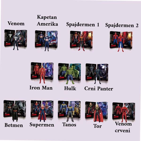 - Dostupno 12 modela: Venom-crni, Venom-crveni, Kapetan Amerika, Spajdermen 1, Spajdermen 2, Iron Man, Hulk, Crni Panter, Betmen, Supermen, Tanos, Tor