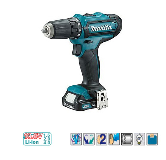 Akumulatorska bušilica Makita ima ugrađeno LED radno svetlo. Brzostezna glava omogućava lako postavljanje i uklanjanje umetka a pritisno dugme za promenu smera je praktično za upotrebu. Ergonomska drška akumulatorske bušilice je najbolja moguća i omogućava udobno držanje pri obavljanju radova. Prekidač za bestepenu kontrolu brzine.