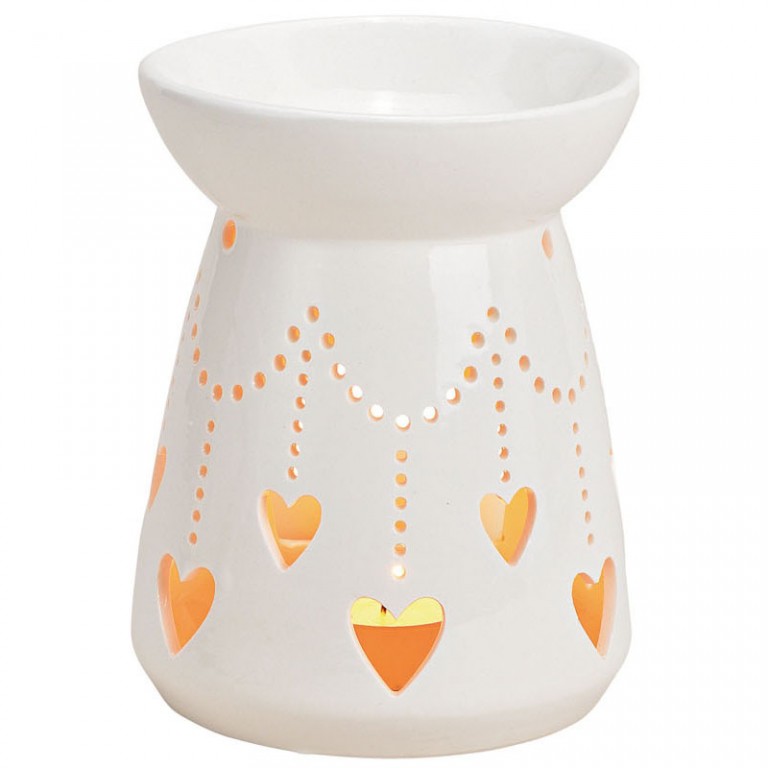 - Bele keramičke aroma lampe sa otvorima u obliku srca. Dimenzije : 10cm x 10cm i visina 13cm