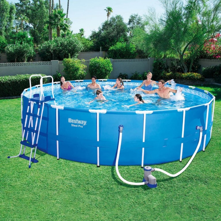 - Nadzemni porodični bazen sa konstrukcijom od metalnih šipki. Lako se montira postavljanjem na ravnu površinu.