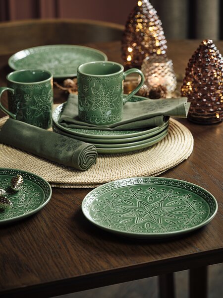 Tanjir od sjajnog zelenog porcelana sa rustičnim božićnim dezenom.