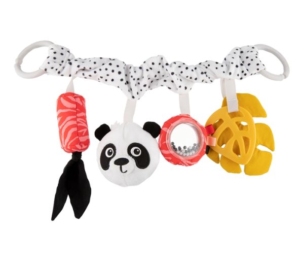 - Svaki element viseće igračke ima drugačiju funkciju – zvono sa mašnom daje delikatne zvukove, mekana plišana panda, napravljena od prijatnog na dodir i mekog materijala, zadržava oblik kada se stisne, ogledalo okruženo šarenim etiketama sa zvečka i dva lista – jedan prijatno šušti, a drugi u obliku zubaca doneće olakšanje tokom nicanja zuba.