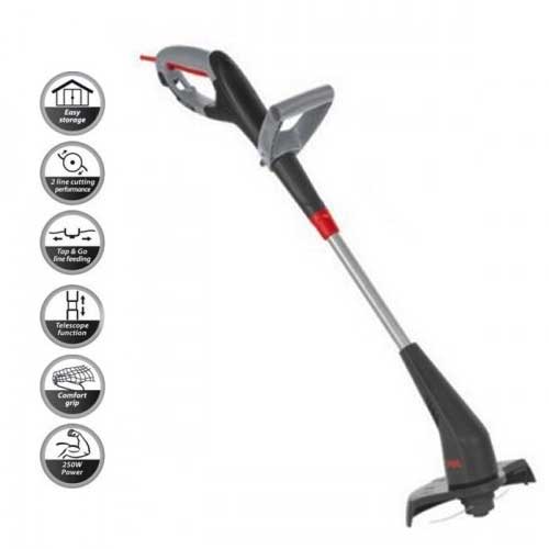 Snažni električni trimer za travu sa strunom biće vam od velike pomoći prilikom sređivanja bašte ili dvorišta. Sistem sečenja sa 2 strune sa koncem izvršava svoje poslove sečenja sa velikom lakoćom. Umetanje strune po principu Dodirni i Kreni za jednostavno otpuštanje dodatnih struna tokom rada ako je potrebno. Moćni motor od 250 W za većinu primena u šišanju trave. Teleskopsko podešavanje visine za povećanje lične udobnosti tokom rada. Veliki prekidač za uključiti/isključiti niske otpornosti za praktično upravljanje. Ergonomska drška za veći komfor. Graničnik kabla sprečava oštećenje na kablu ili alatu.