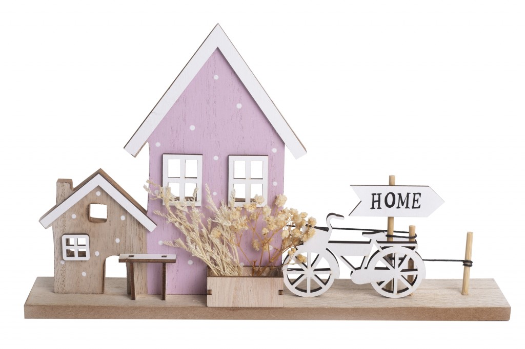 - Ukrasna figura u obliku kuće sa žardinjerom, biciklom i malim putokazom sa natpisom "home".