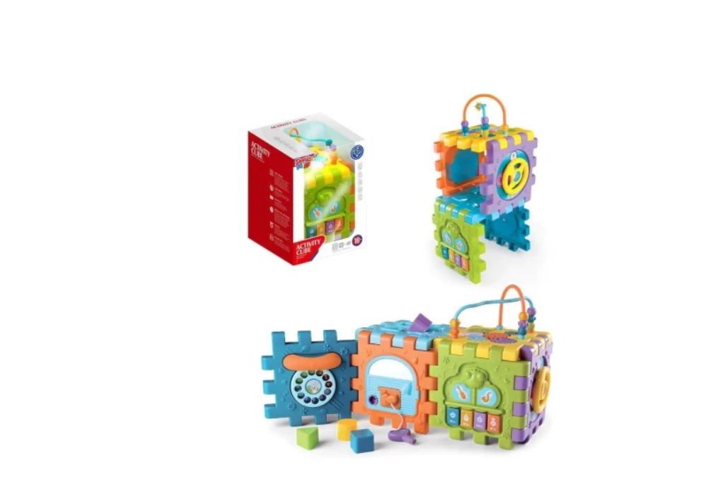 - Vrsta: prve didaktičke igračke za bebe Set od: 10x elemenata, 6x ploha, 4x oblika. U setu: 1x ele ktronska igračka kocka. Izazovi: razvrstavanje geometrijskih oblika, vodilica, vratašca s ključem, ogledalo, piano s melodijama, rotirajući zupčanici, telefon s brojčanikom i zvučnim efektom, volan s gledalo, piano s melodijama, rotirajući zupčanici, telefon s brojčanikom i zvučnim efektom, volan s zvučnim efektom i dr. Značajka: kocka se može rastaviti i presložiti po želji. Potrebne baterije za efekte 3x AAA 1.5V, nisu uključene. Materijal izrade: čvrsta ABS plastika, sigurna, netoksična. Dob