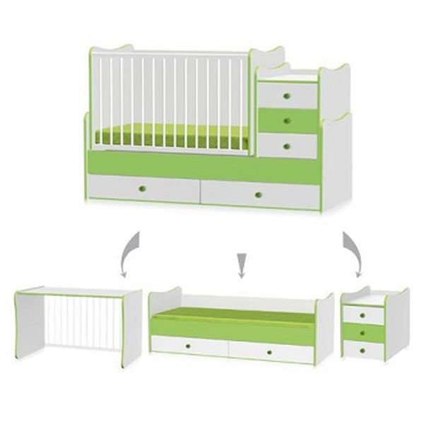 Sadrži tri dela koji čine jednu celinu: kolevku, krevetac za odraslo dete i ormarić
