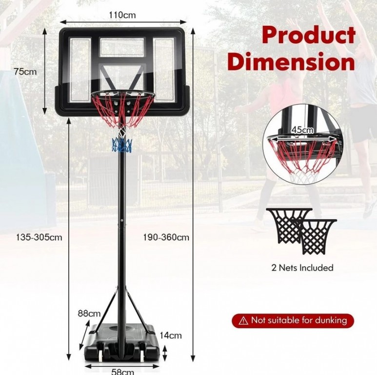- Ovaj podesivi sistem koša otporan na vremenske uslove napravljen je od metalnih cevi otpornih na rđu, HDPE baze, PE i PVC table, što ga čini izdržljivim za dugotrajnu upotrebu na otvorenom.