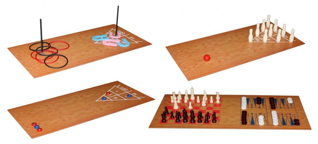Višenamenski sto za igru koji obuhvata gotove sve popularne igre za zabavu sa prijateljima ili porodicom. Komplet sadrži table i svu opremu potrebnu za igru fudbala, bilijara, hokeja, stonog tenisa, kuglanja, šaha, checker-a, backgammon-a, shuffleboard-a, potkovica, bacanje prstena i kartaških igara. Kompaktne dimenzije stola i jednostavan princip izmene tabli štede prostor a pružaju mogućnost beskonačne igre i zabave.