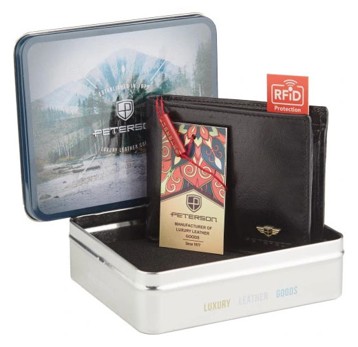 - Kožni muški novčanik u luksuznoj, poklon metalnoj kutiji sa mekom podlogom da se ne ošteti novčanik. Na prednjoj strani ima u donjem desnom uglu metalni znak firme Peterson. Novčanik je sa RFID zaštitom. Ima devet odvojenih mesta za kartice, dva odeljka providna (za karticu koja se najčešće koristi , ili pak za fotografiju) . Sve se osigurava kopčom. U sredini ima mali rajsfešlus za važne sitnice . Takođe ima odeljak za sitan novac , a celom dužinom ima dva razdvojena odeljka za papirni novac. Dimenzije novčanika kada je sklopljen 12X9X3CM. Dimenzija metalne kutije 14X11X4CM.