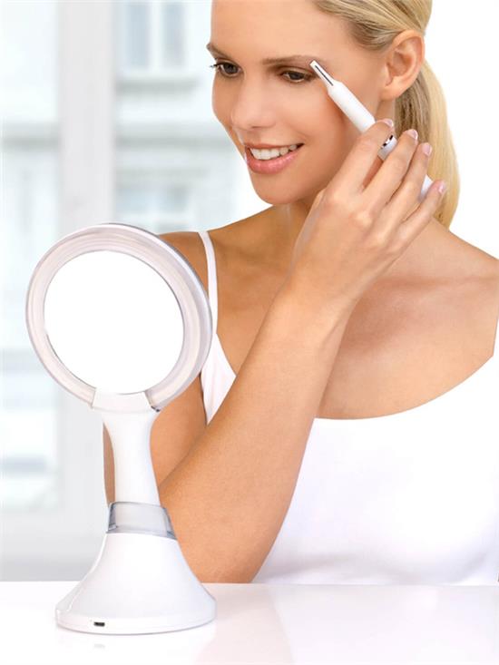 - Ogledalo za šminkanje sa LED osvetljenjem koje se može koristiti u stojecem položaju ili u ruci;Savršeno za šišanje, šminkanje, uklanjanje dlaka ili brijanje;Dvostrano uvecanje 1x i 5x Dve razlicita nivoa svetlosti prirodna dnevna i jaka svetlost; Ukljucuje indukcioni punjac (osnova) za bežicno punjenje; Silk’n ogledalo Lumi radi bez baterija i lako puni pomocu indukcionog punjaca i prateceg USB punjaca sa kablom;