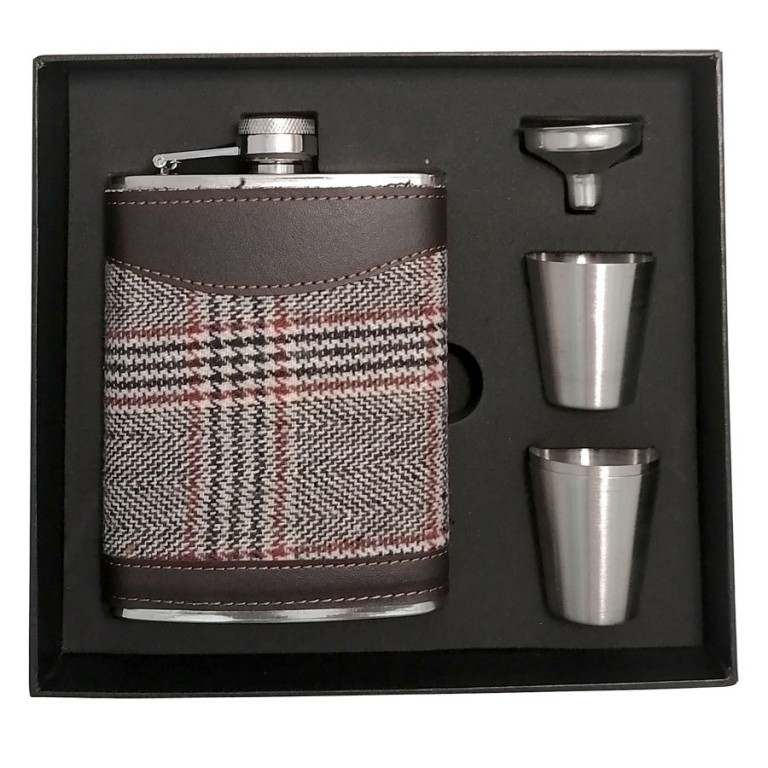 - Poklon set: pljoska obložena braon karo tkaninom 240ml , levak za sipanje, dve čašice. Pakovana u crnu poklon kutiju.