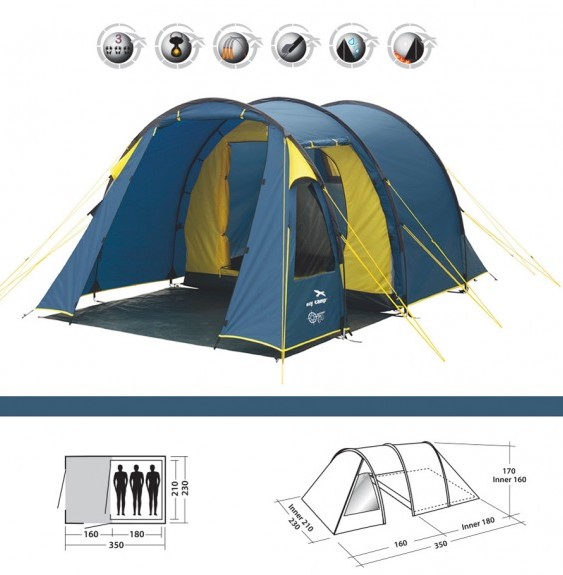 Tunelni šator za 3 osobe. Sistem zaštite od požara Fire Retardant – šator se neće zapaliti već će se polako istopiti. Spoljašnost šatora izradjena je od 180T poliestera sa polietilenskim premazom i hidrostatičkim stubom 2000mm.Unutrašnji deo šatora izradjen je od poliestera koji omogućava protok vazduha. Pod šatora izrađen je od nepromočivog polietilena