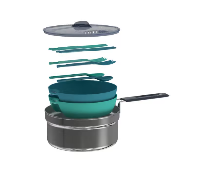 - Šerpa, poklopac/cediljka, 2 tanjira (0,5 l), 2 seta od 3 komada pribora za jelo.