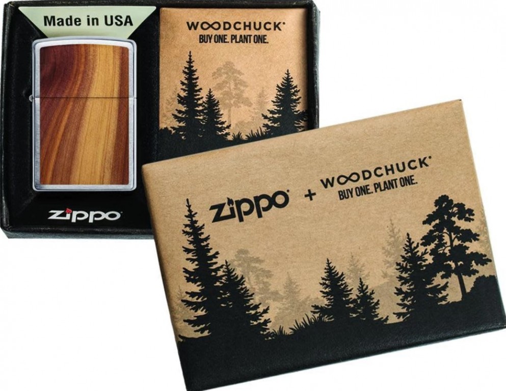 Zippo, u partnerstvu sa Woodchuck -om i njihovim Bui One. Plant One.® program, posadiće jedno drvo za svaki prodati upaljač. Ovi upaljač su napravljeni korišćenjem laserski rezanih dizajna amblema, napravljenih od 100% pravog drveta, koji će pomoći u obnavljanju i zaštiti šuma sveta. Potrošači mogu da koriste poseban kod u svakoj kutiji da saznaju gde im je zasađeno drveće. Ovaj upaljač od brušenog hroma ima dvostrani amblem kedra koji može da sadrži varijacije pruga plavog drveta pomešane sa dubljim tonovima što svaki upaljač čini jedinstvenim. Dolazi upakovano u poklon kutiji. Za optimalne performanse punite Zippo gorivo za upaljač.