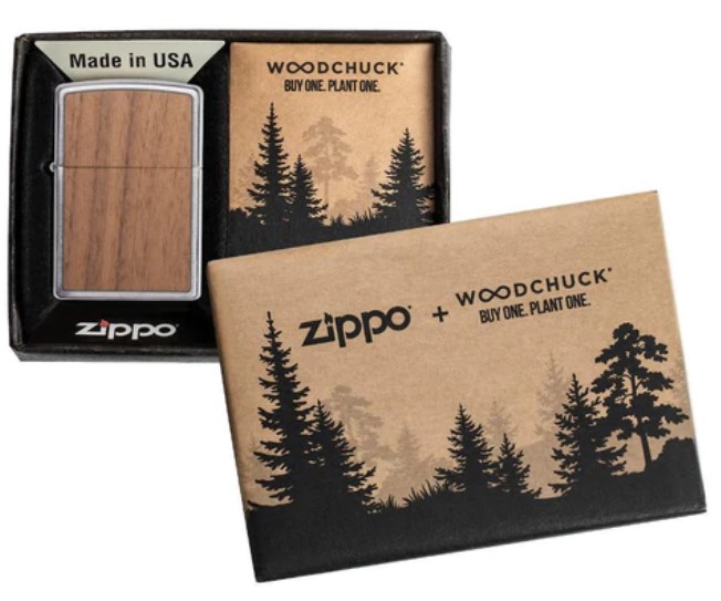 Zippo, u partnerstvu sa Woodchuck -om i njihovim Bui One. Plant One.® program, posadiće jedno drvo za svaki prodati upaljač. Ovi upaljač su napravljeni korišćenjem laserski rezanih dizajna amblema, napravljenih od 100% pravog drveta, koji će pomoći u obnavljanju i zaštiti šuma sveta. Potrošači mogu da koriste poseban kod u svakoj kutiji da saznaju gde im je zasađeno drveće. Ovaj upaljač od brušenog oraha ima dvostrani amblem kedra koji može da sadrži varijacije pruga plavog drveta pomešane sa dubljim tonovima što svaki upaljač čini jedinstvenim. Dolazi upakovano u poklon kutiji. Za optimalne performanse punite Zippo gorivo za upaljač.