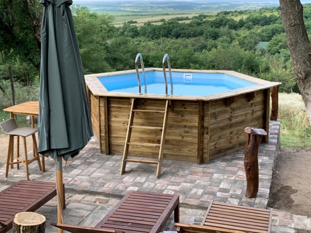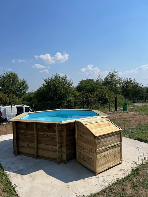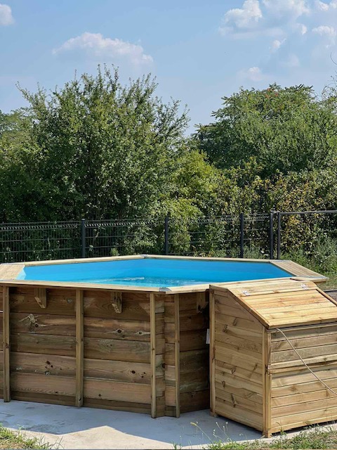 - – oprema : plava PVC obloga sa anti UV tretmanom, drvena konstrukcija ,filter set od 4m3/h + 20kg peska , drvene spoljne stepenice, unutrasnje stepenice od ne rdjajuceg celika, stitnici za dno i zidove bazena , 1 skimer , prikljucna creva , zastitni pokrivac za dno.
